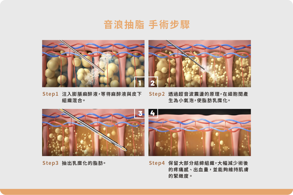 因超音波震盪只針對脂肪作用,並不會傷害到周邊的結締組織,跟傳統抽脂相比更加安全、恢復期更快速也能減少術後出現肌膚凹凸不平的問題。