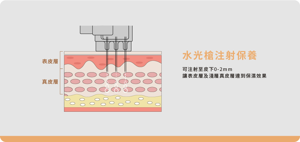 所以「保濕」又可以被稱作肌膚的保養的根源,利用水光槍將保濕精華液注入至真皮層中,來恢復皮膚中的水平衡,並改善皮膚的彈性和膚色,從根本解決肌底問題。