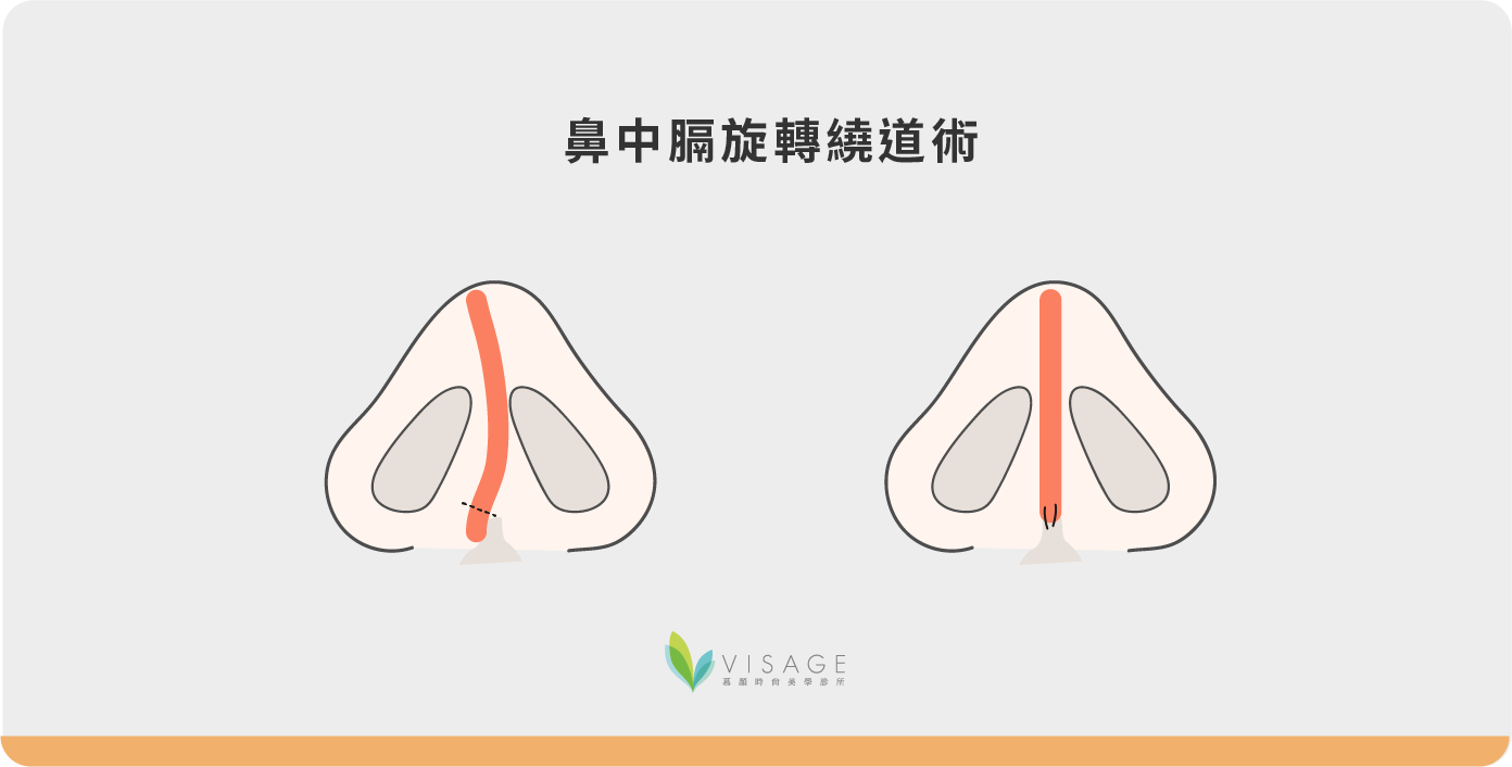 鼻中膈旋轉繞道術 Swinging door maneuver 是將尾端彎曲的鼻中膈軟骨剝離出來,並選轉至中線位置,也可依照鼻中膈骨的長度來切除過長的部分,這種手術方式適用於尾端鼻中膈彎曲的患者,可以有效改善鼻塞情形,並恢復鼻子的外觀。