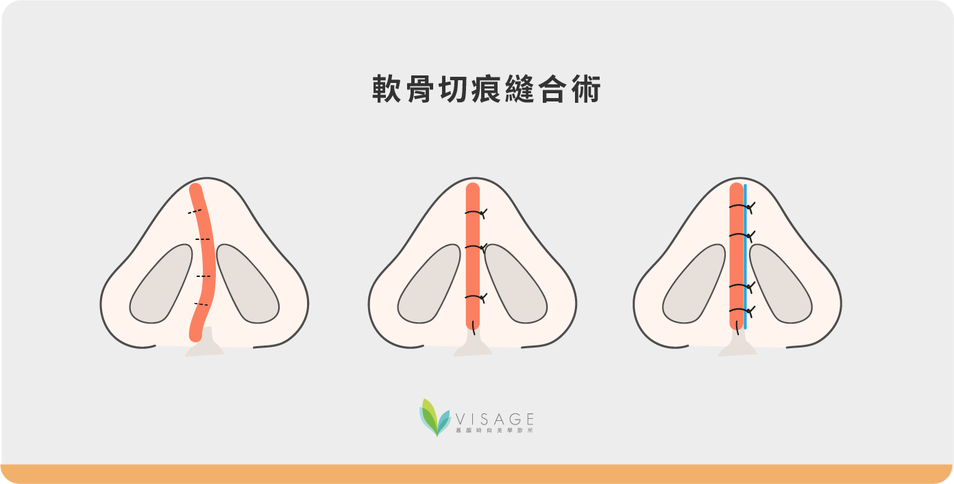 若鼻中膈旋轉繞道術無法妥善的改善尾端鼻中膈,您也可以採軟骨切痕縫合術Scoring & Sutures technique 來加強鼻部結構,透過縫合自體軟骨,可以讓鼻中膈的形狀更加平直,同時提供更有力的支撐,達到加強結構的效果。