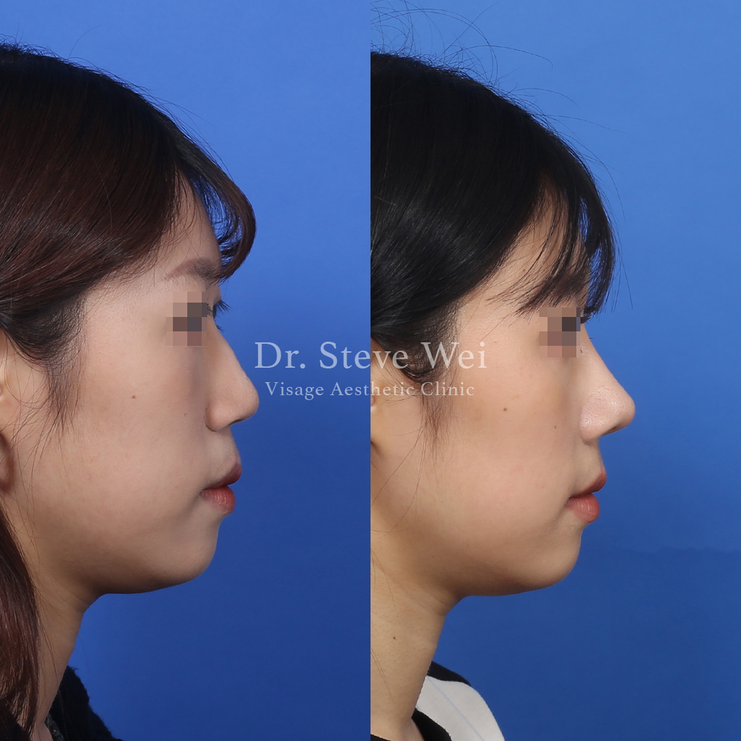 手術採用二代矽膠結合自體軟骨進行結構式調整,強化鼻頭支撐,做出有弧度但不過於誇張的海鷗線,同時墊高鼻基底,改善中臉比例。